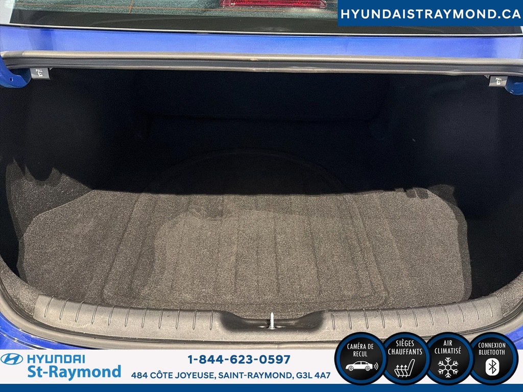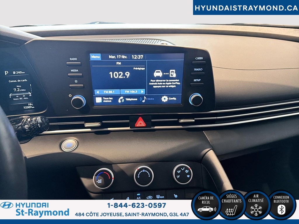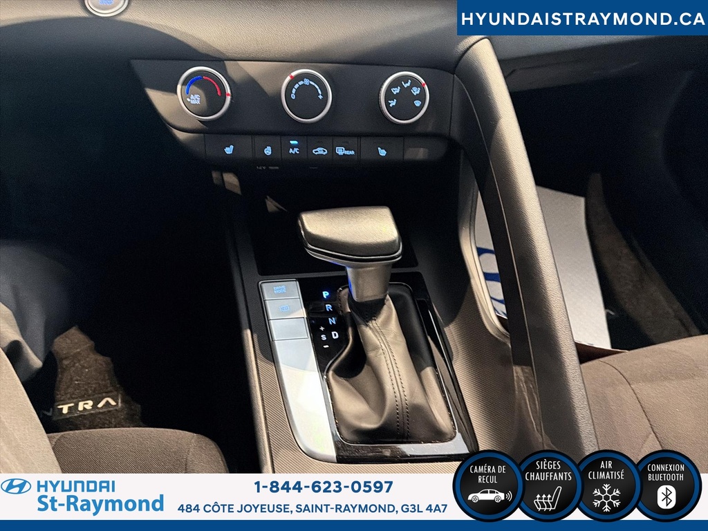 Ce Hyundai Elantra Preferred IVT 2022 usagé, offert chez Hyundai St-Raymond à St-Raymond, est une berline 4 portes gris avec intérieur noir. Il affiche 72 300 km et combine un moteur 2,0 L sans plomb à une transmission automatique à variation continue (TVC) pour une conduite douce au quotidien. CARACTÉRISTIQUES DU Elantra Preferred IVT »» Moteur 2,0 L sans plomb »» Transmission TVC (variation continue) automatique »» Traction avant pour conduite stable »» Démarrage par bouton-poussoir pratique CARACTÉRISTIQUES DE SÉCURITÉ AVANCÉES »» Surveillance des angles morts »» Avertissement de sortie de voie »» Caméra de recul pour manoeuvres précises »» Coussins gonflables latéraux et latéraux tête PERFORMANCE ET EFFICACITÉ »» Moteur 2,0 L pour usage quotidien »» Transmission automatique TVC à variation continue »» Direction assistée pour manoeuvres faciles »» Contrôle de stabilité pour meilleure tenue CONFORT »» Sièges avant chauffants »» Climatisation avant »» Volant réglable et volant en cuir »» Rétroviseurs chauffants pour l'hiver TECHNOLOGIE ET CONNECTIVITÉ »» Intégration Bluetooth pour appels et audio »» Commandes audio directement au volant »» Radio HD pour réception plus claire »» Phares automatiques pour éclairage simplifié ESPACE DE CHARGEMENT »» Coffre avec ouverture à distance »» Accès facile par 4 portes »» Verrouillage automatique des portes »» Pneu de secours inclus APPRÉCIÉ DES AUTRES PROPRIÉTAIRES »» Conduite souple avec transmission à variation continue »» Sièges avant chauffants appréciés en hiver »» Aides à la conduite utiles au quotidien »» Bluetooth simple pour téléphoner mains libres GARANTIE Garantie originale du manufacturier: 31 Mars 2027 ou 100000 Km. Garantie de bon fonctionnement A - 6 mois ou 10,000 km Avec son équipement axé sur la sécurité (surveillance des angles morts, avertissement de sortie de voie, caméra de recul) et son confort (sièges avant chauffants, climatisation, rétroviseurs chauffants), ce Hyundai Elantra Preferred IVT 2022 est un choix logique pour les déplacements à St-Raymond et les environs, été comme hiver. Le NIV de ce Hyundai Elantra Preferred IVT 2022 est le KMHLM4AG8NU318190 .