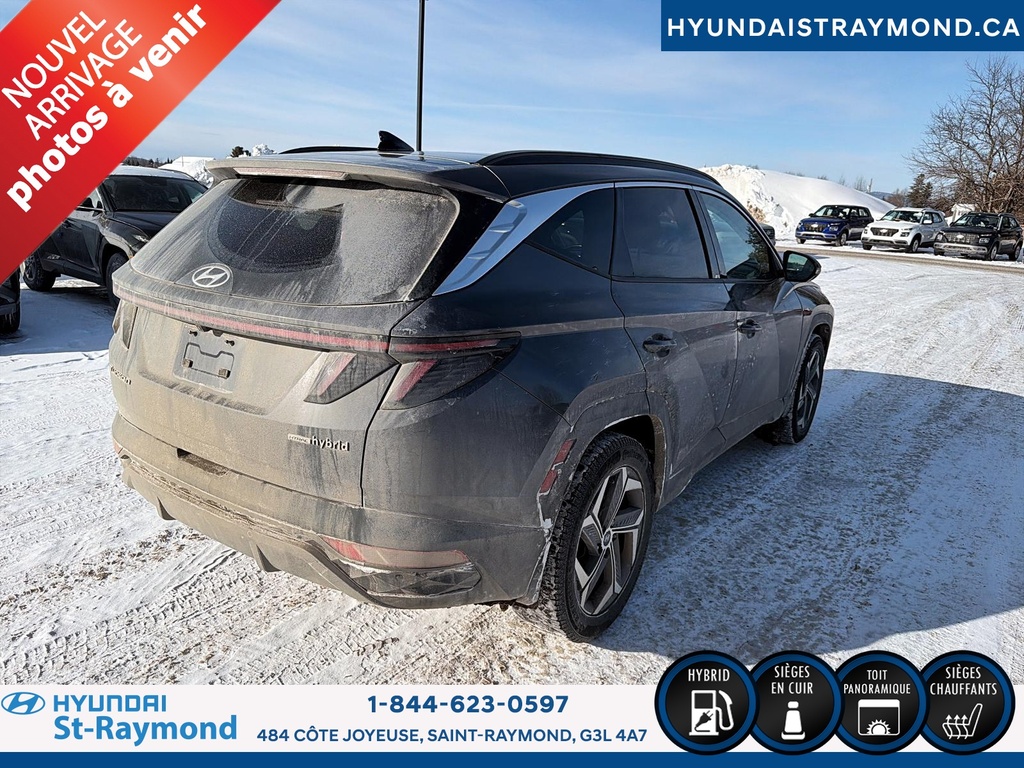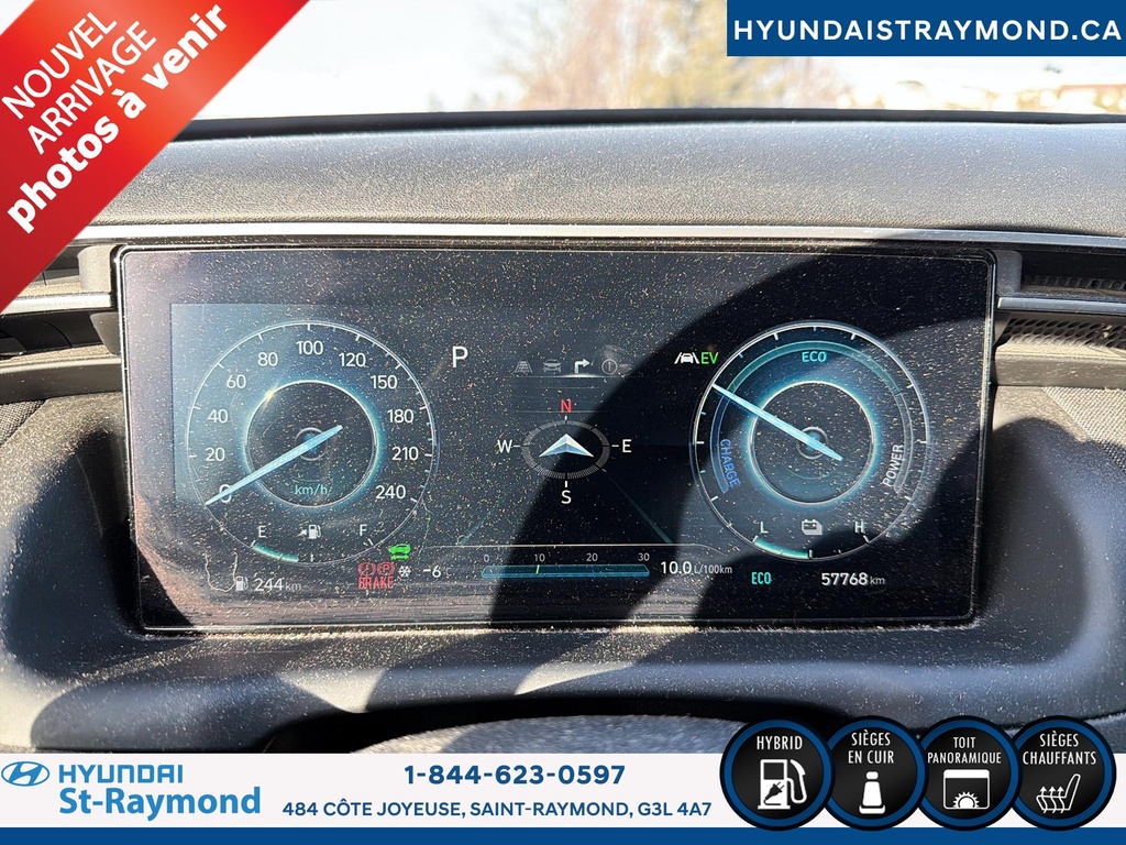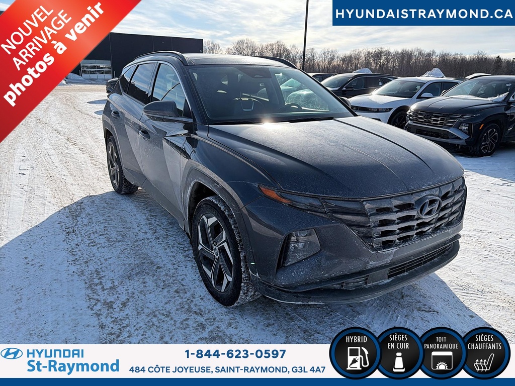// UN SEUL PROPRIÉTAIRE // Le Hyundai Tucson 2023 version Luxe hybride !!! offert chez Hyundai St-Raymond à St-Raymond est un VUS hybride bien équipé, avec 57 768 km. Il se démarque par son moteur 1,6 L hybride, sa transmission automatique, sa finition extérieure grise et son habitacle noir. Un choix logique pour rouler confortablement au quotidien. CARACTÉRISTIQUES DU VÉHICULE HYBRIDE »» Moteur 1,6 L hybride »» Transmission automatique à double embrayage »» Boîte automatique à 6 vitesses »» Gestion hybride pour réduire la consommation CARACTÉRISTIQUES DE SÉCURITÉ AVANCÉES »» Avertissement de sortie de voie »» Surveillance des angles morts »» Caméra de recul »» Coussins gonflables latéraux et rideaux PERFORMANCE ET EFFICACITÉ »» Transmission automatique pour conduite sans effort »» Direction assistée pour manoeuvres plus faciles »» Contrôle de stabilité pour meilleure tenue de route »» Système de freinage antiblocage (ABS) CONFORT »» Sièges avant chauffants »» Sièges arrière chauffants »» Climatisation avant à deux zones »» Siège conducteur à réglage électrique lombaire TECHNOLOGIE ET CONNECTIVITÉ »» Intégration Bluetooth pour appels et audio »» Système de navigation (GPS) intégré »» Commandes audio au volant »» Radio satellite et radio HD ESPACE DE CHARGEMENT »» Hayon électrique pour accès simplifié »» Accès au coffre arrière »» Ouverture à distance du coffre »» Banquette arrière pour objets longs APPRÉCIÉ DES AUTRES PROPRIÉTAIRES »» Confort en hiver grâce aux sièges chauffants »» Sentiment de sécurité avec angles morts »» Facilité de stationnement avec caméra recul »» Agrément au quotidien du groupe hybride GARANTIE Garantie originale du manufacturier: 20 Mai 2028 ou 100000 Km. Garantie de bon fonctionnement A - 6 mois ou 10,000 km Au quotidien, ce Hyundai Tucson 2023 version Luxe hybride !!! mise sur des commodités utiles: démarrage par bouton-poussoir, démarreur à distance, vitres électriques, rétroviseurs électriques chauffants avec clignotants, phares automatiques à DEL, dégivreur de vitre arrière, vitres teintées et verrouillage automatique des portes. Le toit ouvrant panoramique en verre ajoute une belle luminosité à l'habitacle. Le NIV de ce Hyundai Tucson Luxe hybride !!! 2023 est le KM8JCCA1XPU119306 .